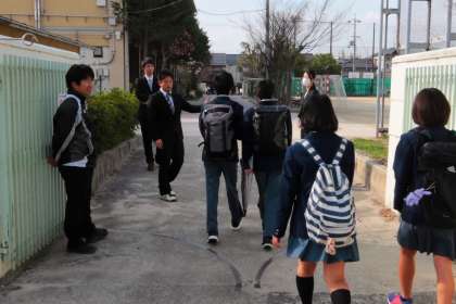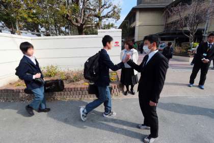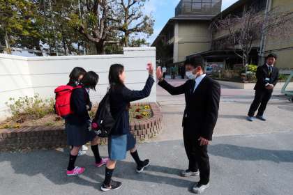 松尾中学校の朝のあいさつ「ハイタッチ」で始まります。元気いっぱい頑張ろう。