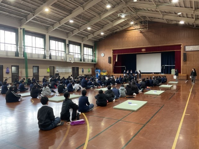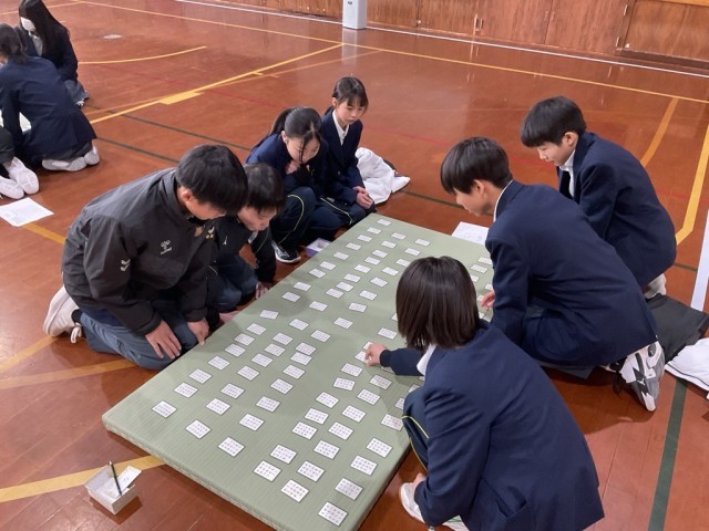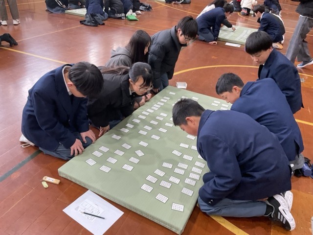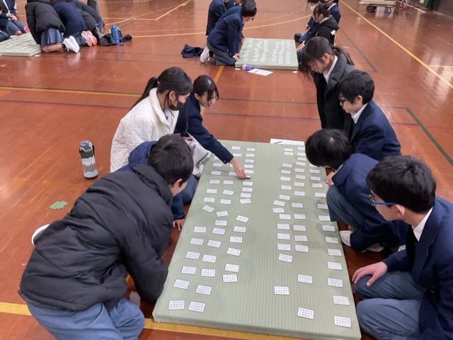 本日、体育館にて百人一首大会が行われました。文化委員さんたちの説明・指示を聞いた後、それぞれの畳に分かれ準備をします。どこに札があるかしっかり見ておいて・・・詠まれた札の下の句にすっと手が伸びていました。取りたかった札は取れたでしょうか?真剣に取り組む姿、札が取れた時の笑顔がとても印象的でした。