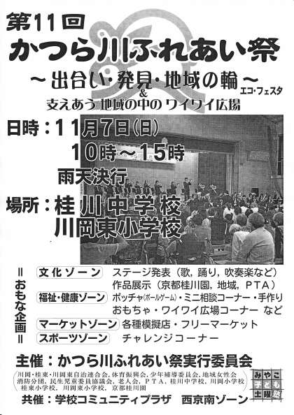明後日11月7日(日)に、”〜出合い・発見・地域の輪〜エコフェスタ&支えあう地域の中のワイワイ広場”のテーマで、「第11回かつら川ふれあい祭」を開催します。会場は、桂川中学校と川岡東小学校で、開催時間は、午前10時〜午後3時ですので、前売りチケットをお持ちの方は、12時30分までに引換えをお願いします。この機会に、かつら川中の3つの地域が一体となり、出合いの輪を広げましょう。現在明後日の開催へ向けて、最後の準備をしているところです。多数の皆様のご参加をお待ちしています。秋の快晴の下での開催を期待します!