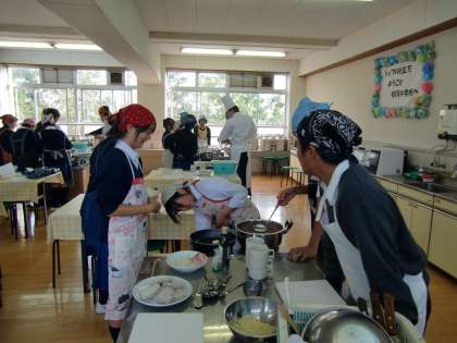 初日の今日は、2・3時間目に2年1組、5・6時間目に2年5組が調理実習を行いました。そのメニューは、『ポタージュ キュルティヴァトゥール』と『牛フィレ肉 パルメザンチーズ風味パン粉焼き トマトソース添え』の2品で、学校中においしそうな香りが漂っています。2年生は、普通では滅多にはできない素晴らしい経験をさせて頂いています。今日頂いたレシピと教わった技術を自分のものとし、今日の夕食は、家族の皆さんに授業の成果を披露して欲しいと思います。
