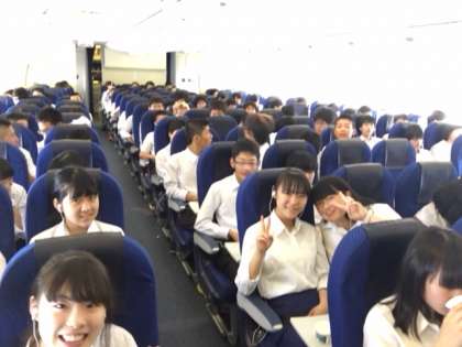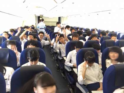 機内の様子です。離陸前や直後はハイテンションでしたが,しばらくすると朝が早かったので静かに休んでいる生徒もいます。