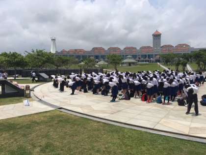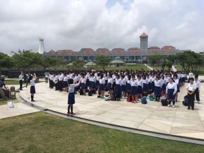 沖縄県立平和祈念公園に到着しました。平和の礎前広場にて,昨年から学習を積み重ねてきた平和学習の成果として,桂川中学校平和宣言を行い,「HEIWAの鐘」も合唱しました。