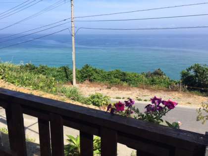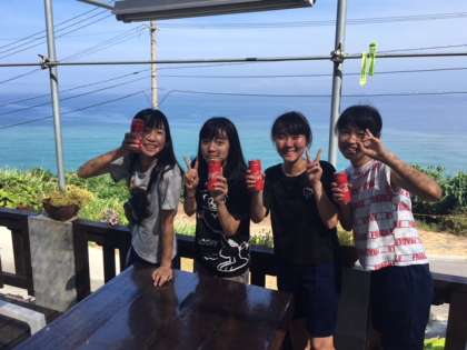 サニーレタスやゴーヤの収穫を終えて,景色の良いテラスにてジュースで乾杯しました。