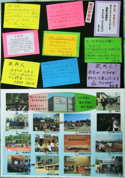 1月10日(月)の成人の日に開催される「京都市成人の日記念式典」の第2会場(みやこめっせ)に「はたちの集いコーナー」が設けられます。そこに、桂川中学校を卒業された新成人の皆さんへのメッセージボードが掲示されます。桂川中学校で3年間を共に過ごした、懐かしい教職員からののメッセージと現在の桂川中学校の後輩たちの様子がまとめられています。式典に参加される皆さんは、是非会場でメッセージボードをご覧ください。