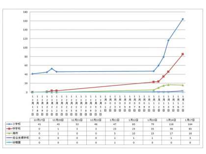 成人の日の後、11日(火)頃から、京都市内の学校でインフルエンザが流行してきました。桂川中学校も、今日の段階でインフルエンザで欠席している生徒が2名となっています。全市的には「インフルエンザの発症に地域的な特性はなく全市的に増加している」との状況です。したのグラフは、京都市内の学校におけるインフルエンザによる欠席状況の推移を示したものです。1月11日から、欠席者が急増しているのがわかります。