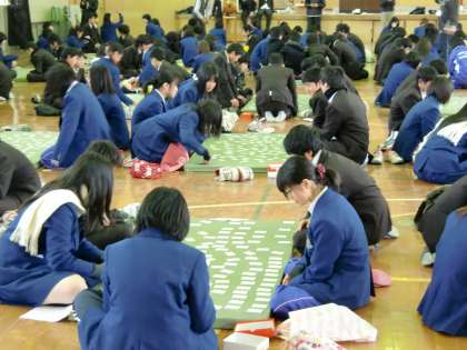 体育館用の石油ストーブのおかげで、温かさが和らぐ体育館で、5・6時間目に2年生の百人一首大会が開催されています。今日の日のために、各クラスで練習を重ねた成果を発揮すべく、取り札を畳に広げ、読み手の大八木先生の声に合わせ、会場のあちこちから「はい!」と元気よく札をとる姿が見られます。参加した生徒たちの熱気で、気温も少し上昇しているようです。皆さんにはそれぞれに”得意札”があると思います。「この札だけは絶対にとるぞ!」という思いで、自然と自分の前に並べたり・・・。校長先生は、安倍仲麿の「天の原 ふりさけ見れば 春日なる 三笠の山に 出でし月かも」でした。