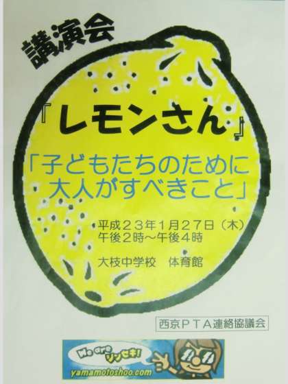 西京支部PTAでは、来週1月27日(木)午後2時より、大枝中学校で「小中合同講演会」を開催します。今回は、『レモンさん』ことラジオDJの山本シュウ氏を講師にお招きして、「子どもたちのために大人がすべきこと」というテーマで、音楽を交えた楽しい講演をしていただきます。また、小中で合同で取り組んでいる”ケータイ”の問題についてもお話しいただきます。