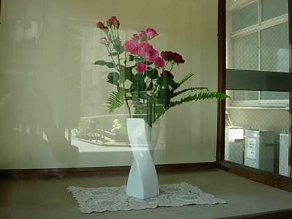 今週の生け花は、可愛いいピンクと赤のミニバラです。これから梅雨にかけて、鮮やかに開きます。トゲには注意を・・・