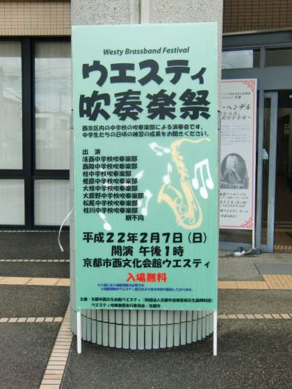 2月6日(日)午前10時30分より、京都市西文化会館ウエスティにおいて、「2010年度 ウエスティ吹奏楽祭」が開催されます。これは、西京区地域生徒指導連絡協議会・西京区中学校PTA連絡協議会・西京区中学校長会の後援で、西京区8校の中学校吹奏楽部が、日頃の練習の成果を発表するものです。今年は、午前と午後に分かれ、4校ずつがそれぞれの演奏と併せて、4校の合同演奏も予定されています。ご多用な折ではございますが、保護者・地域の皆様には、ぜひご参加いただき、生徒たちの演奏に大きな声援を賜りますよう、宜しくお願いいたします。