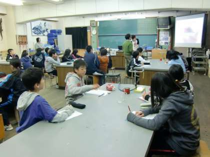 授業体験が始まりました。川岡東小学校は、1組:数学,2組:英語,3組:理科です。どのクラスも真剣に授業を受けていますね・・・!