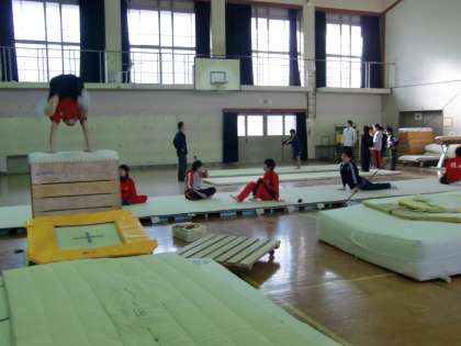 体操は先輩のすごい演技の横で、マット運動の練習です。卓球は卓球台の周りを軽快に走るところから・・・。野球はグランドの関係で、今日は教室でミーティングです。
