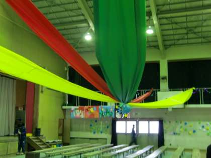 体育館の飾りつけは、そんな生徒会本部の意見を結集した素晴らしい出来栄えでした。壁面のメッセージや装飾・電飾に加え、天井からは地球儀を中心に、未来へと向かい3年生をイメージして、赤・黄・緑の3色の布が四方に張り巡らされています。