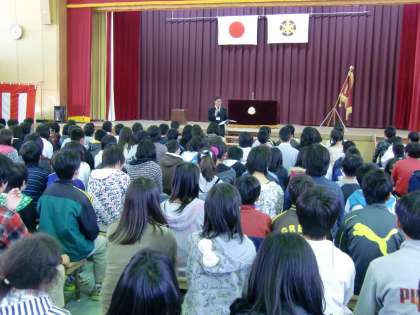 午後1時にハッピーステーションでクラス発表をした後、新クラスで整列し、体育館に入場から、式のリハーサルを行いました。明日の入学式を前に、司会の教頭先生の話に、少し緊張している姿が印象的でした。