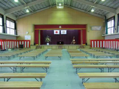 暖かい朝を迎えました。少し曇ってはいますが、雨の意心配はなく、まさに”入学式日和”です。校門の桜も満開となり、心地よい春風に揺られています。舞台はすっかり整いました。午後10時の開式を前に、”主役”の登場を待っている桂川中学校の様子です。