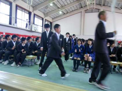 今日は校門の桜も満開で、絶好の”花見日和”です。朝から温かい1日で、体育館の中は、うっすら汗ばむほどの熱気を感じました。