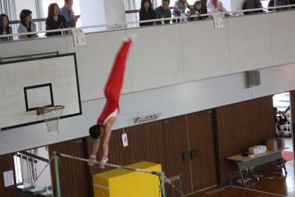 5月5日に体操の自由演技が行われました。我が桂川中は、前日の規定演技を終えて2位です。1位は去年の優勝校、北野中です。それぞれの得点の総合がチームの得点です。小さなミスが重なると大きな差になってしまいます。こんな時こそ毎日の練習の成果が問われます。一人一人がミスなく、ベストの演技をすることができて初めて勝利をつかむことができるのです。今回は足を痛めている選手もいて、全員がベストとは言えませんが、それぞれの選手が今出せる最大の力を発揮できたのではないかと思います。堂々の2位!胸を張ってください。