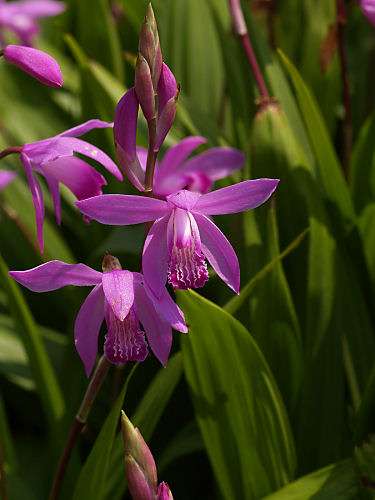 園芸の部類では、ランというよりも、多年草の草花としての扱いのほうが強いようです。5〜6月に花茎を30から50cmほどにのばし5輪ほどの花をつけます。花色は主に濃いめの赤紫ですが、白色のものや、薄紫色の品種もあります。