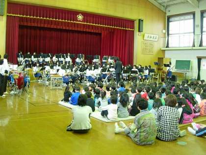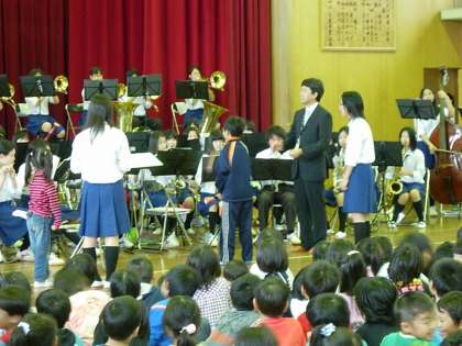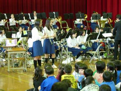 5月30日(月)川岡東小学校で開催されました「音楽鑑賞」に本校の吹奏楽部が参加しました。楽器の紹介や劇仕立ての演奏などで楽しんでいただきました。後半には、指揮者体験も行い、体験した児童も緊張しながらではあったもの一生懸命タクトを振ってくれました。また、桂川園のお年寄りも参加され、楽しいひと時を過ごしていただけたと思います。
