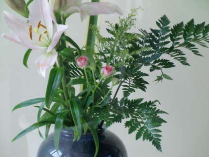 ≪今週の生け花≫ソリダスター,すかしゆり,ニューサイラン,スプレーバラ,レザーファン 6月6日(月)〜