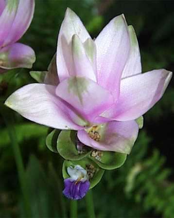 夏休み明けの最初はクルクマです。クルクマというのはショウガ科ウコン属の属名です。和名はキョウオウ(薑黄)で,難しい漢字ですが,漢和辞典によれば「薑」の訓読みは「はじかみ」,「しょうが」で,ショウガ科の植物であることがわかります。さらに,ハルウコン(春鬱金)という別名もあります。キョウオウに似ているものにウコン(鬱金)というのがありますが,ウコンは花の色が黄色です(苞は白)。クルクマは晩春から初夏にかけて花が咲くので,「春に咲く鬱金」というわけです(ウコンは夏から秋に咲きます)。