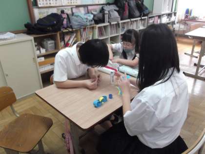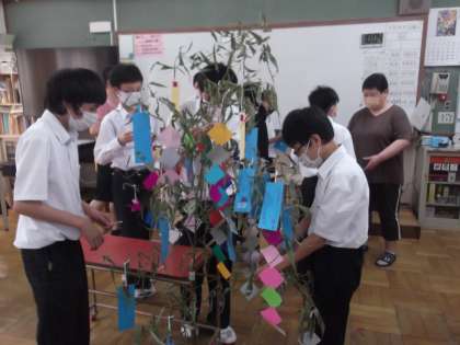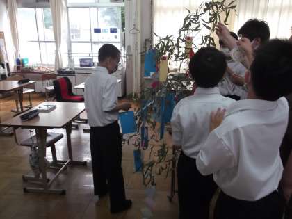 1・2組では,今日の美術の時間に願いごとを書いた短冊と,手作りの七夕飾りを一つ一つ丁寧に笹に取り付けていました。ここがいかなぁ,ここさびしいなぁとあれこれ言いながら全体のバランスも考え飾りつけをしていました。願いごとが叶いますように。