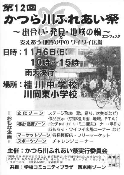 今年で12回目を迎える「かつら川ふれあい祭」が、11月6日(日)に桂川中学校と川岡東小学校を会場に開催されます。この催しは、桂川中学校区全体の地域や各校PTA等の連携と交流を目的としており、地域コミュニティーの構築と青少年の健全育成に大きい役割を果たしています。
