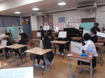 自己紹介のあとは,西総合支援学校の紹介です。授業や学校行事など,学校生活について,パワーポイントでわかりやすく説明していただきました。次は質問コーナーです。事前に伝えておいた生徒たちからの質問に,先生や先輩たちに答えていただき,西総合支援学校のことがよくわかり,身近に感じることができました。そのあとも「以心伝心」ゲームなど,楽しい時間を過ごすことができました。西総合支援学校の先生方,生徒の皆さん,ありがとうございました。