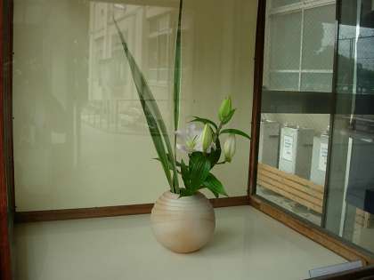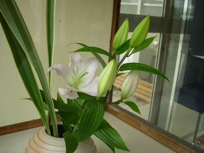 夏休みまであと1週間。今日は梅雨の中休みで、朝から蒸し暑い晴天の1日です。こんな暑い日には、大輪のユリの花が爽やかさを表現しています。今回の生け花では、左側の細長い葉に注目してください。