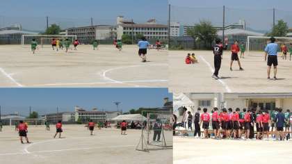 5日(祝)に深草中学校において決勝トーナメントが行われました。女子同様午前中に1回戦が行われ,24−8で松尾中学校に勝利することができました。午後からの準決勝においては,四条中学校と一進一退の試合展開で最後の最後まで粘りを見せましたが,あと一歩届かず,17−18で残念ながら敗れました。しかしながら,本当に「チーム桂川」の気持ちで戦ってくれたと思います。7日には3位決定戦が予定されていますので,必ず勝利をつかんでください!