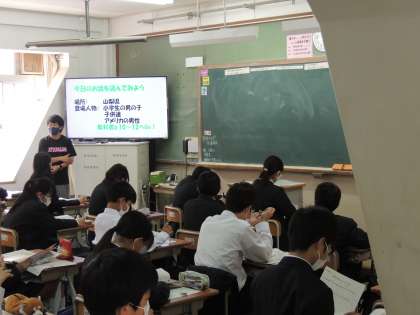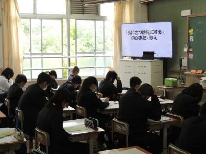 本日6日(金)4限に全学年で,今年度3回目の「道徳」の授業がありました。1年生は,B(7)礼儀「あいさつを交わして」で授業を行いました。本校のあたりまえ10ケ条1番「あいさつは,先にする」ことについて導入で触れながら本題へと入っていきました。これからも1時間1時間,道徳の授業を大切にしてほしいと思います。