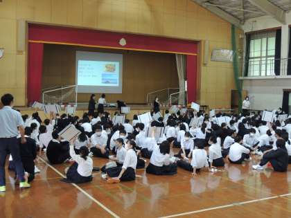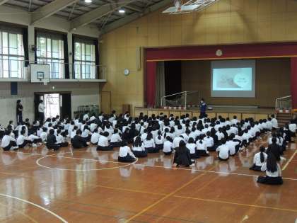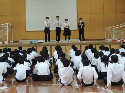 本日27日(金)4限に体育館におきまして「3年学年集会」が行われました。各クラスの協議員が中心となって,集会を運営してくれました。レクレーションの時間もあり,学年の絆をみんなで体感してくれたと思います。修学旅行に向けて学年・クラスのまとまりを大切にしてほしいと思います。