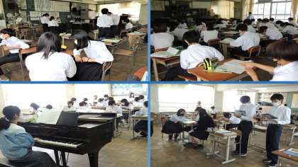 本日1日(水)の授業の様子です。1,3年の音楽の授業および3年の生徒総会議案書討議の様子です。6月に入り,蒸し暑い日が続きますが,頑張って学習してください!また,15日の生徒総会に向けての話し合いもよろしくお願いします。