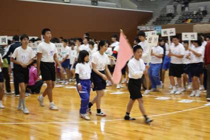 今日午前9時50分から、京都府立体育館で「第53回京都市中学校育成学級・総合支援学校 合同運動会」が開催され、本校の1・2組の5名が参加しました。6月の合同球技大会と、11月の合同運動会は毎年恒例になっており、今回も全市から431名の仲間が参加して盛大に行われました。
