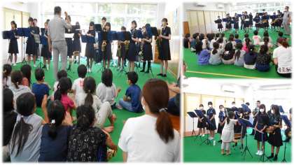 吹奏楽部の2,3年生中心に、桂東児童館で演奏をしました。児童館のなつまつりを盛り上げてくれました。アンコールの演奏が終わると、未就学の子どもたちから大きな声で「ありがとうございました」とお礼の言葉、そして手作りのメダルをもらいました。児童館の子どもたちは大喜びでした。館長さんからも感謝の言葉をいただきました。吹奏楽部の皆さん、地域での活躍ありがとうございます。来年もよろしくお願いいたします。
