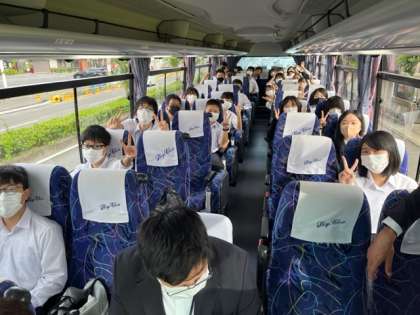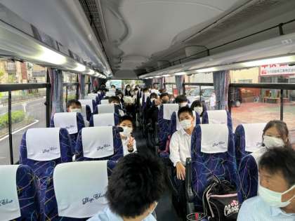 3年生を乗せたバスは、新名神高速道路を使って、先ず愛知県の工場見学地に向かっています。土山SAと湾岸長島PAで休憩を取ります。バス内の様子です。