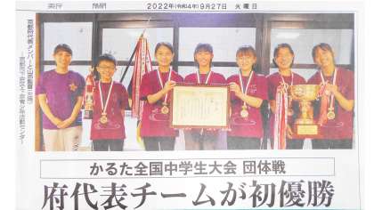 先月9月27日の京都新聞に、かるた全国中学生大会の記事が掲載されました。本校の3年生に京都府代表メンバーに選出された生徒がいます。3年ぶりに開催されたこの大会の団体戦で、京都府代表は強豪の東京都代表に勝利し、初優勝をしました。猛練習の成果を発揮し、本当に素晴らしい結果となりました。おめでとうございます!!