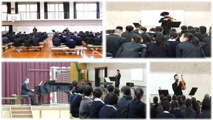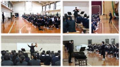本日の1年生の総合的な学習の時間に、ゲストティチャーとしてプロのバイオリニスト「井上 隆平さん」をお招きしました。たくさんの有名な曲を生演奏していただきました。ご講演の中では、実際にバイオリンを弾かしてもらったり、バイオリンの音色に合わせて手を楽器にして(手拍子で)合奏したり、特別な時間を過ごすことができました。中学時代、卓球部に所属していた井上さんは、バイオリンから離れる時期もあったそうです。公演後には、熱心に質問する生徒もいました。将来の夢や職業を考える「ヒント」はありましたか?