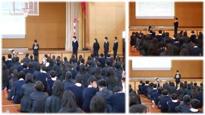 入学して、もうすぐ1年が経とうとしています。本年度最後の集会は、前半に職業調べの発表がありました。各クラスの素晴らしかった内容を、生徒自身が説明してくれました。夢や目標が伝わりしっかり調べられていました。後半は1年間のまとめの話でした。2年生はもうすぐです。来年度のさらなる飛躍を期待しています。