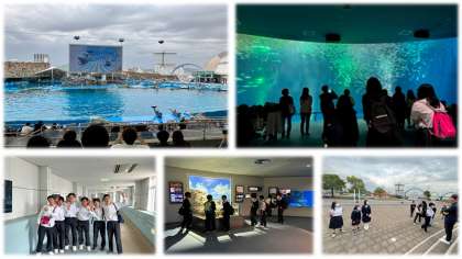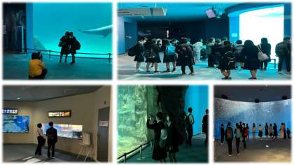 イルカショーが始まりました。大水槽では、イワシのトルネード!じっくり魚に見入っている生徒、何がいるんですか?