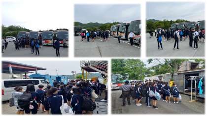 今回の自然体験は、ワカサギ釣り・サイクリング・ウェイクボード・バスフィッシング・SUP・ウォータロデオ・クラフト体験の7種類が用意されています。生徒は、体験別バスに乗り込み各会場に移動しました。