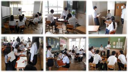 先月2年生が取り組んだ「生き方探求チャレンジ体験学習」(職場体験)のまとめの会が行われました。各生徒が、事業所で体験し学んだことをポスターセッションの形式で、学年みんなに発表しました。暑い中、廊下と教室で熱心に、思い思いのブースで友だちに質問をしていました。