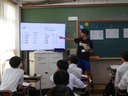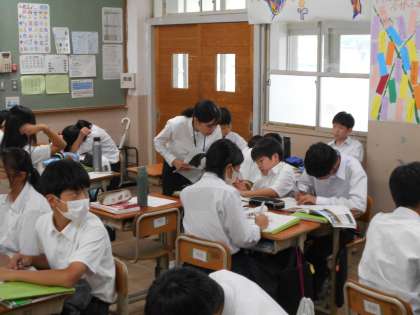 今日は実習生3名が研究授業を行いました。国語では「昭和の父親像」をテーマに、ベン図を利用して生徒の意見交流が活発になされていました。社会は「アマゾン川流域の森林伐採」のメリットとデメリットについて考え、グループ討議や発表がありリズムのある授業でした。保健体育の授業では飲料水を教材として、水道やその衛生管理について学習しました。ホワイトボードを活用したわかりやすい授業でした。