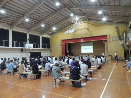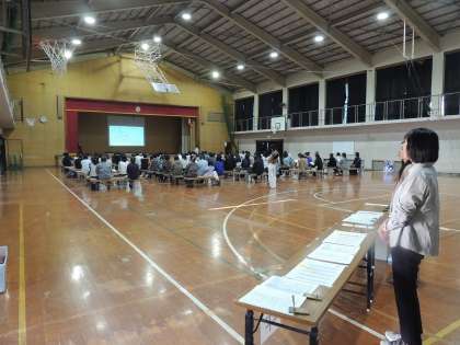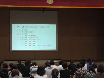 本日11日(水)午後3時30分から体育館におきまして、進路保護者会を開催させていただきました。およそ100名の保護者の参加がありました。進路指導主事から昨年度の本校の進路状況や今年1年間の流れなどを説明させていただきました。進路に向けて、今後ともよろしくお願いいたします。
