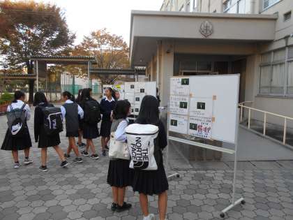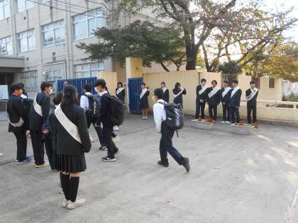本日より11月9日(木)まで、選挙活動週間となります。今朝は正門前で立候補者が、登校してくる生徒にあいさつをしています。ホワイトボードには、選挙ポスターが掲示されています。10日(金)に行われる生徒会役員選挙までしっかりアピールしてください!