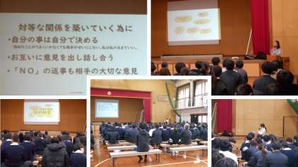 午後の体育館では、3年生が性教育の講演を聞いています。西京区役所保健福祉センターより保健師さんと助産師さんに来ていただき、異性関係と性感染症についてお話していただいています。生徒一人一人が遠い問題ではないことを認識し、よりよい行動が選択できるようになってくれるといいです。自分を大切にし人を思う気持ちがを大切にすることは、人権についての考えと同じだと思います。