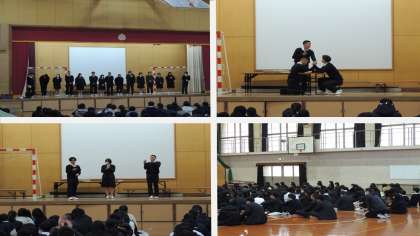 本日21日(木)2限、3年生は2学期のまとめとなる学年集会を体育館で行いました。レクレーション大会や受験に向けてのクラス発表等がありました。いよいよ12月も残りわずか。受験前の大切な時期です。体調には十分に気を付けて、冬休みを過ごしてください。そして、中学校生活残り3ケ月を充実したものにしていきましょう!