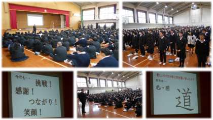 全校生徒と教職員が体育館に集まり、3学期始業式が行われました。校長先生は冒頭、石川県能登半島沖地震について触れられ、来週予定の避難訓練の重要性についても指摘されました。そして昨年の「心・感」に続き、新年の誓いとして「道」について全校生徒にお話をされました。生徒会からは、来週から始まる「生徒会グレードアップ週間」について各委員長から説明がありました。新年早々、学校は一気に活発になります。今年も桂川中学校の「道」をしっかり歩んでください!全校生徒に期待しています!