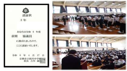 本日6時間目は、前期学級役員認証式でした。各クラスで決めた協議員と各委員を認証する会です。先日行われた春体激励会のように、全校が集まって激励や認証をするのは、それだけ大切な役割なのです。本日認証された生徒の皆さんを中心に桂川中学校の生徒会活動を盛り上げてください。よろしくお願いします。