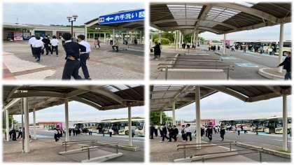 三木SAでトイレ休憩をしました。少し休んですぐに出発です。天気は何とかもっているようで、行程も順調です。広島までの道のりはまだまだですが、気を付けて進んでください。平和記念公園到着予定は、13時すぎです。