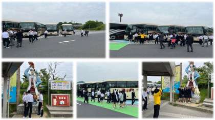 岡山県の吉備SAに到着しました。小休憩をとって間もなく出発です。桃太郎と記念撮影です。車酔いは大丈夫ですか?次は小谷SAです。広島が近づいてきました!